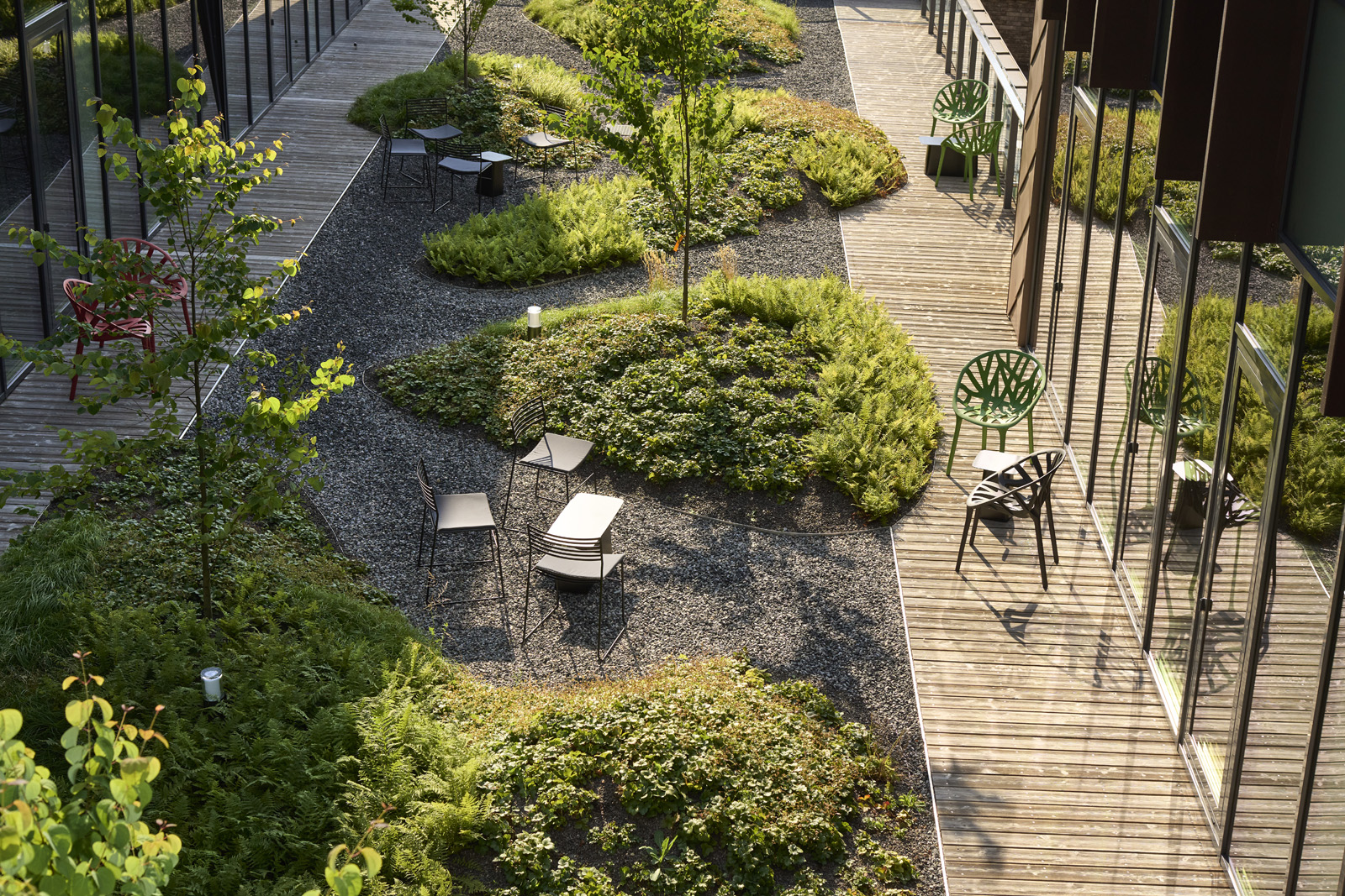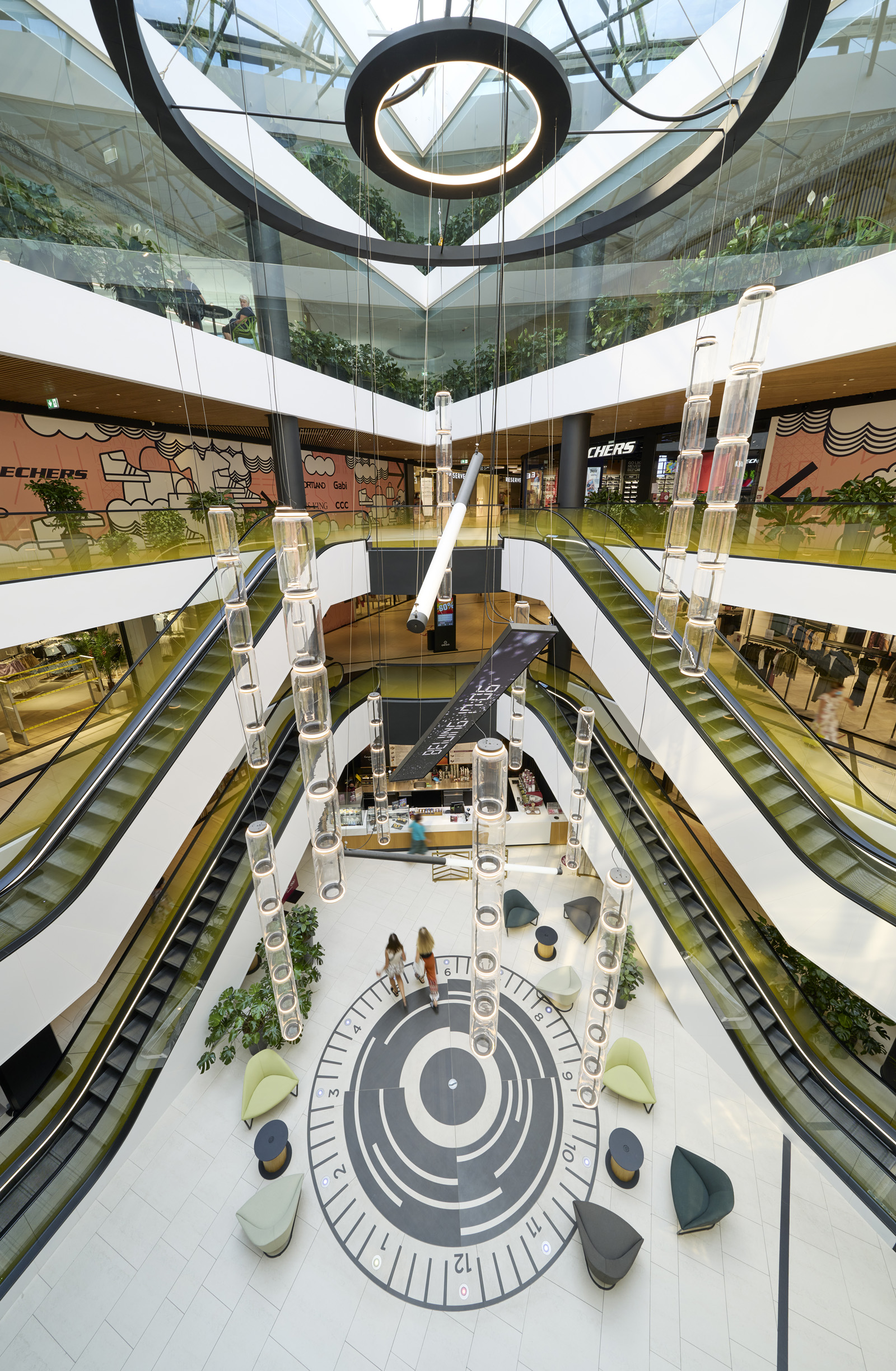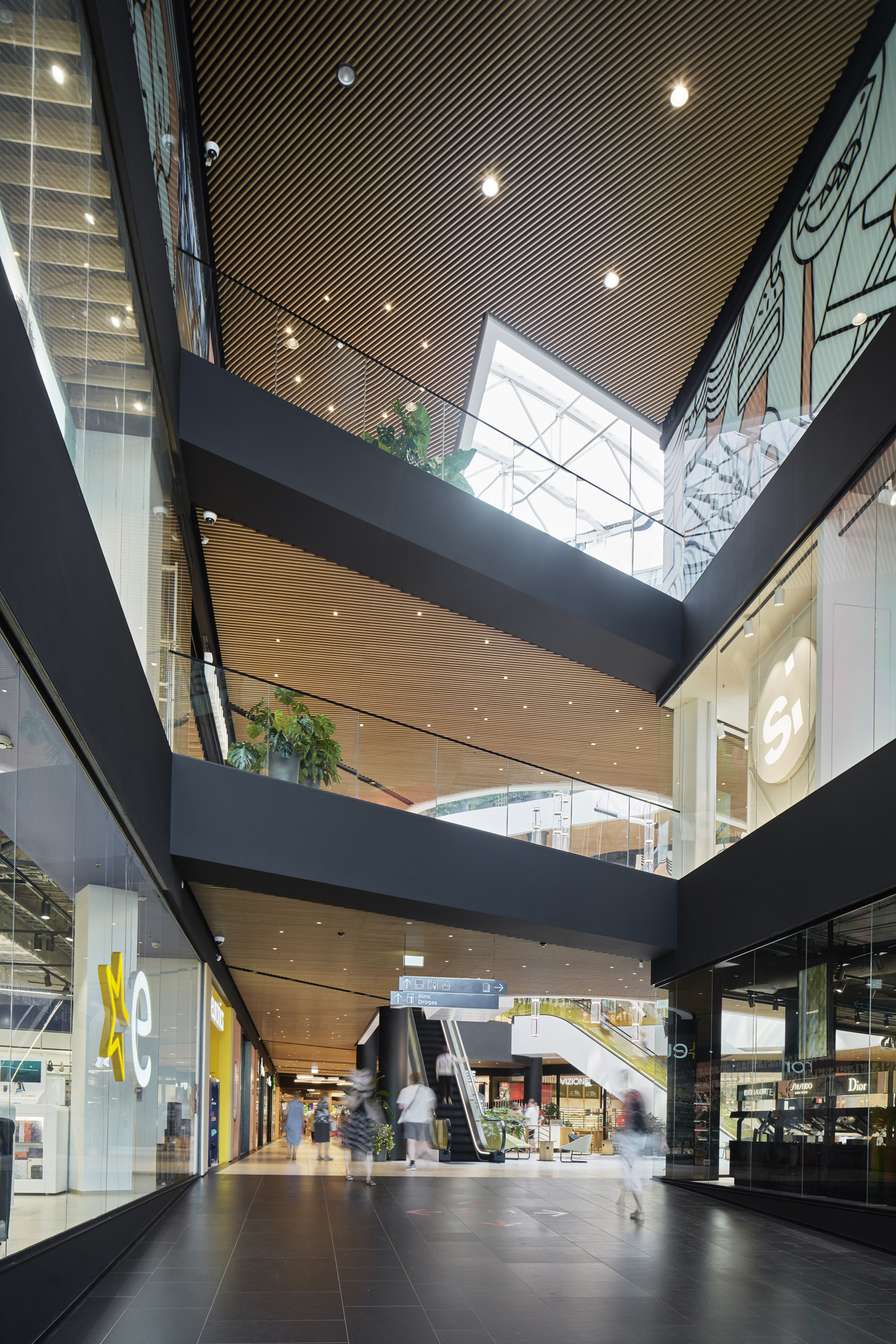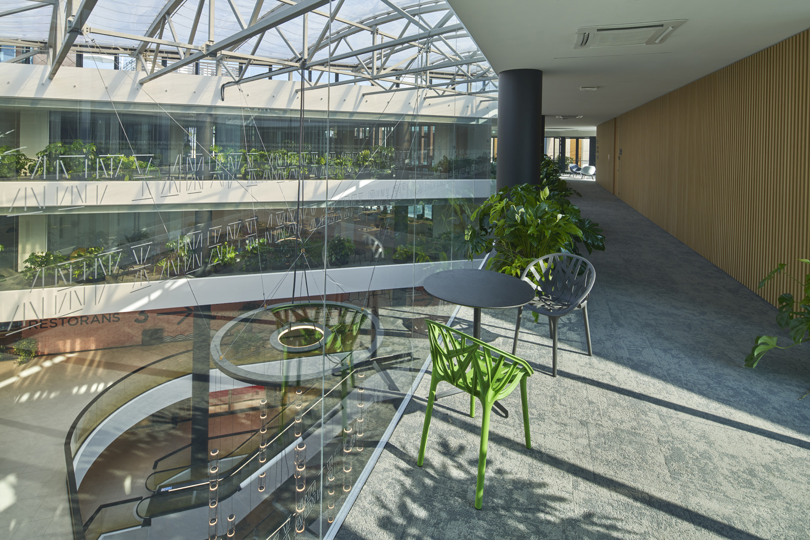 Augstākajos stāvos, kuros izvietoti biroji, telpas tiek tuvinātas dabai. Publiskās zonas gaišo un tīro interjeru papildina augi un zaļās sienas, kas sapludina iekštelpas ar starp birojiem izveidotajiem apzaļumotajiem iekšpagalmiem.