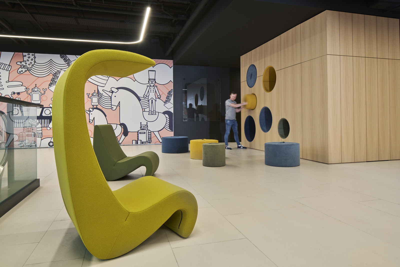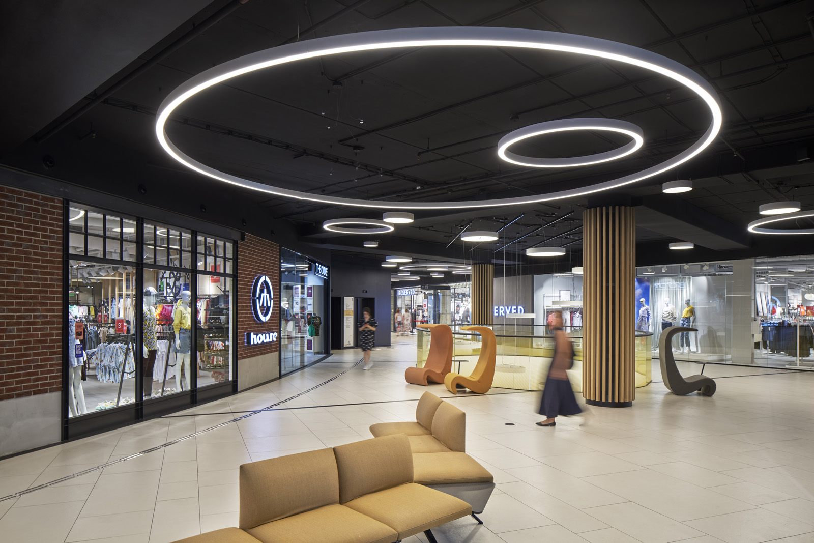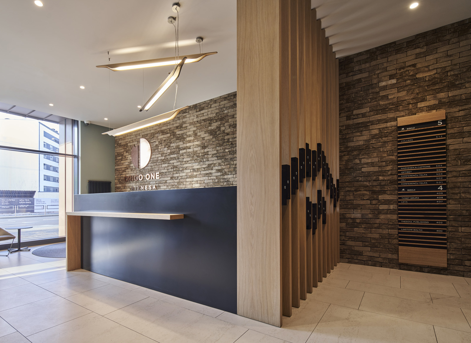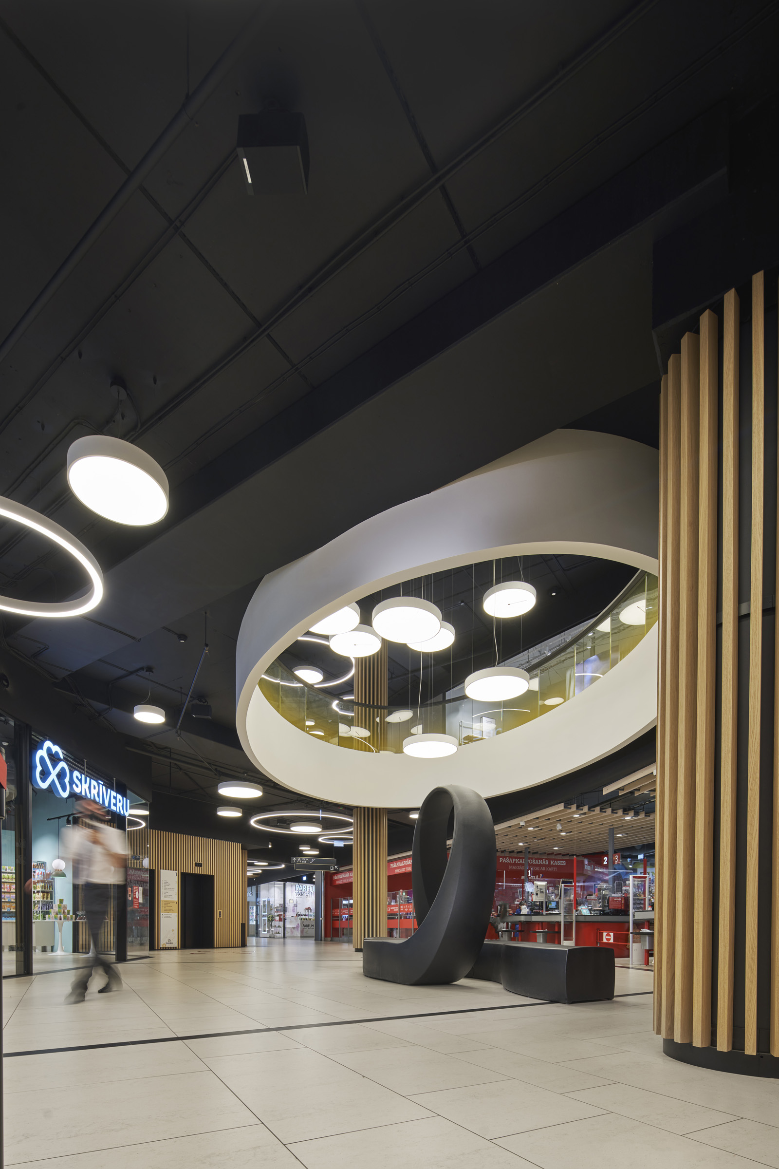 Interjeram izvēlētie kafijas toņi, kas papildināti ar pelēcinātiem krāsas akcentiem, rada mierpilnu atmosfēru. Krāsu gammai komplimentē arī dabiskie apdares materiāli. Masīva ozolkoka latojums ēkā ienes ziemeļniecisku mājīgūmu, savukārt izturīgās Dekton grīdas flīzes ir ilgtspējīga izvēle, kas atmaksāsies ilgtermiņā. Centra apgaismošanai izvēlēti grafiski gaismekļi, kas kārtoti dažādās organiskās kompozīcijās, un vienlaikus kalpo arī kā navigācijas elements.