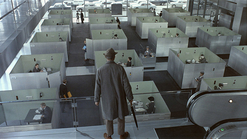 Olivares also describes how twentieth-century workplace design reflected broader changes in corporate culture by becoming increasingly standardised and hierarchical. The French film maker Jacques Tati satirised this brilliantly in 1967’s «PlayTime» by depicting his bumbling anti-hero Monsieur Hulot trying – and failing – to navigate row upon row of seemingly indistinguishable cubicles in a dystopian modern office.