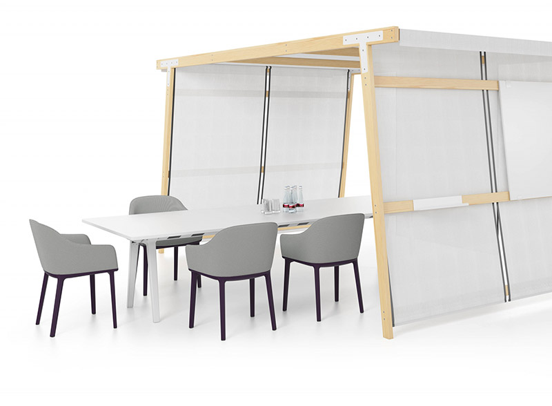 In 2002’s Joyn, their first project for Vitra, the Bouroullecs applied the same principles to external workplaces by developing a modular desk system with adjustable screens that could create private areas for individuals as well as being opened up to accommodate meetings. Two years later, they introduced the Joyn Hut, a mobile enclosed workspace that could be moved around, often to create small temporary offices within bigger ones.